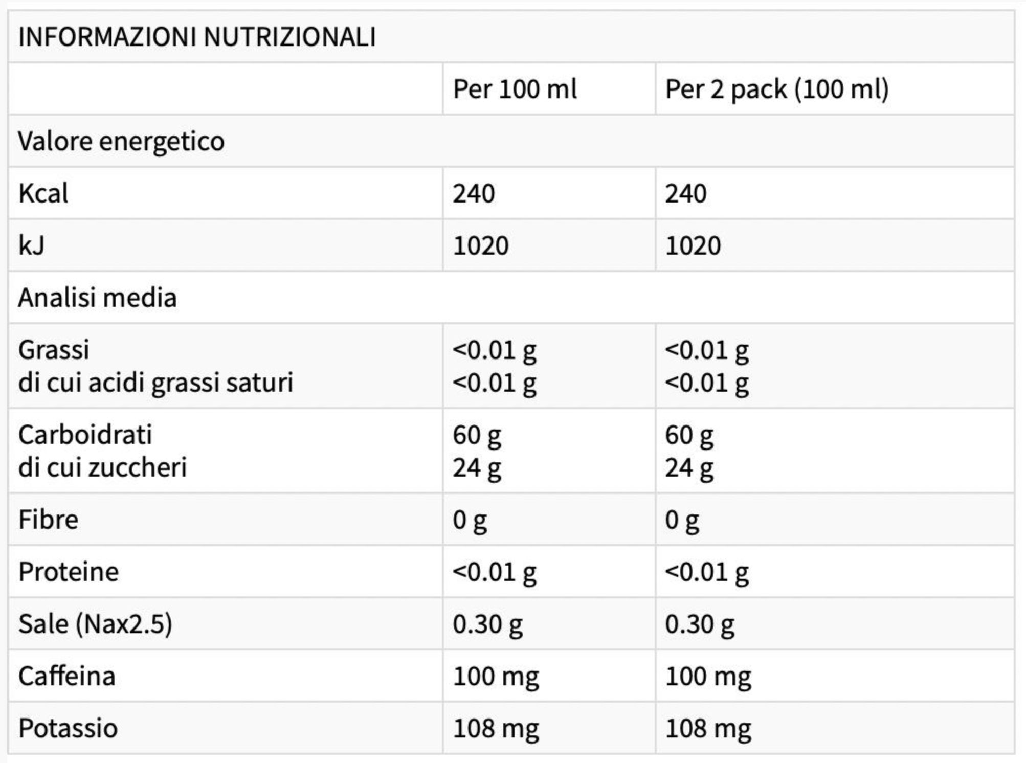 - Con potassio e caffeina (100 mg/dose - 121 mg/dose gusto cola)